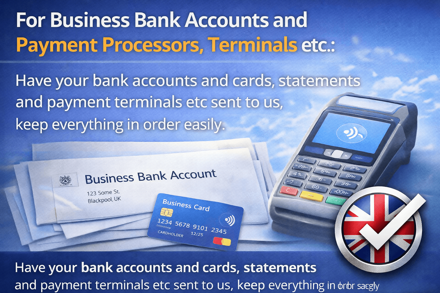 Have your bank accounts and cards, statements and payment terminals etc sent to us, keep everything in order easily.